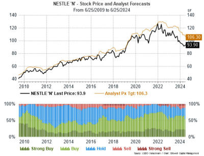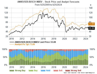 the traded stock price, the brown line the consensus analyst stock price forecast. The lower panes