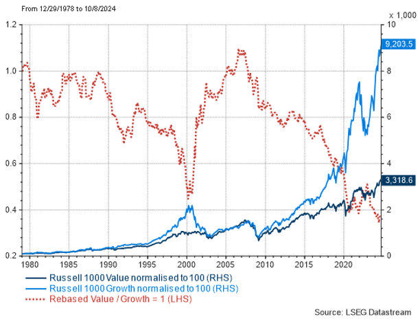 Fig 1: Russell 1000 Value versus Growth, normalised, 45 years