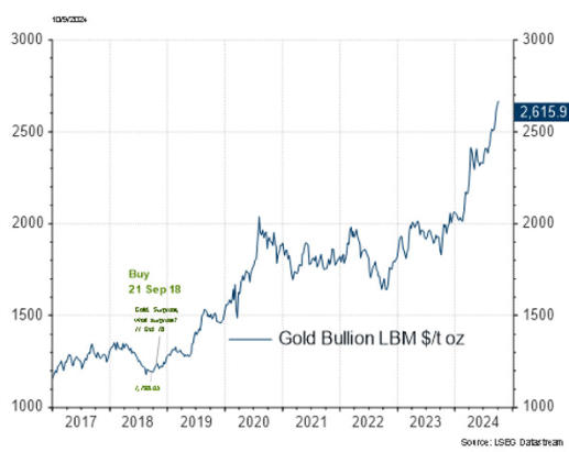 Fig 6: Gold Bullion, London Bullion Market, USD per Troy Ounce (inc. Eriswell Recommendations)