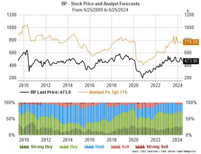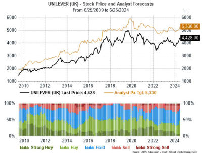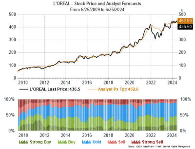 the traded stock price, the brown line the consensus analyst stock price forecast. The lower panes